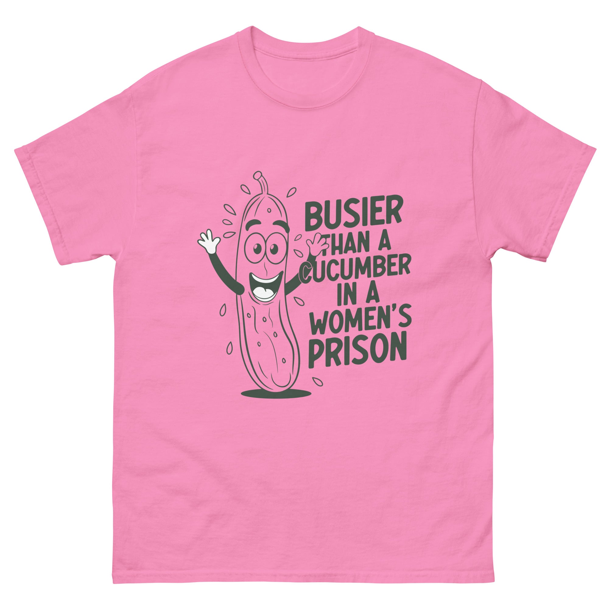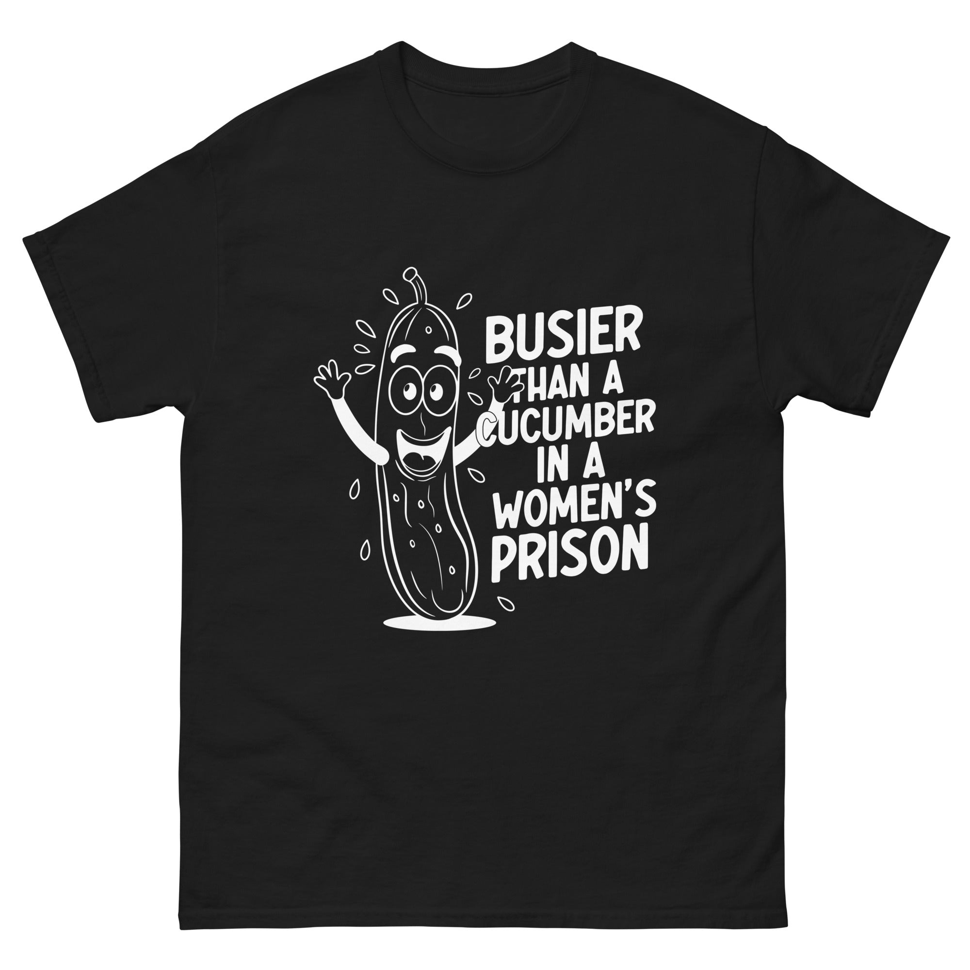 T-shirt featuring our iconic Busier Than A Cucumber In A Women's Prison design.