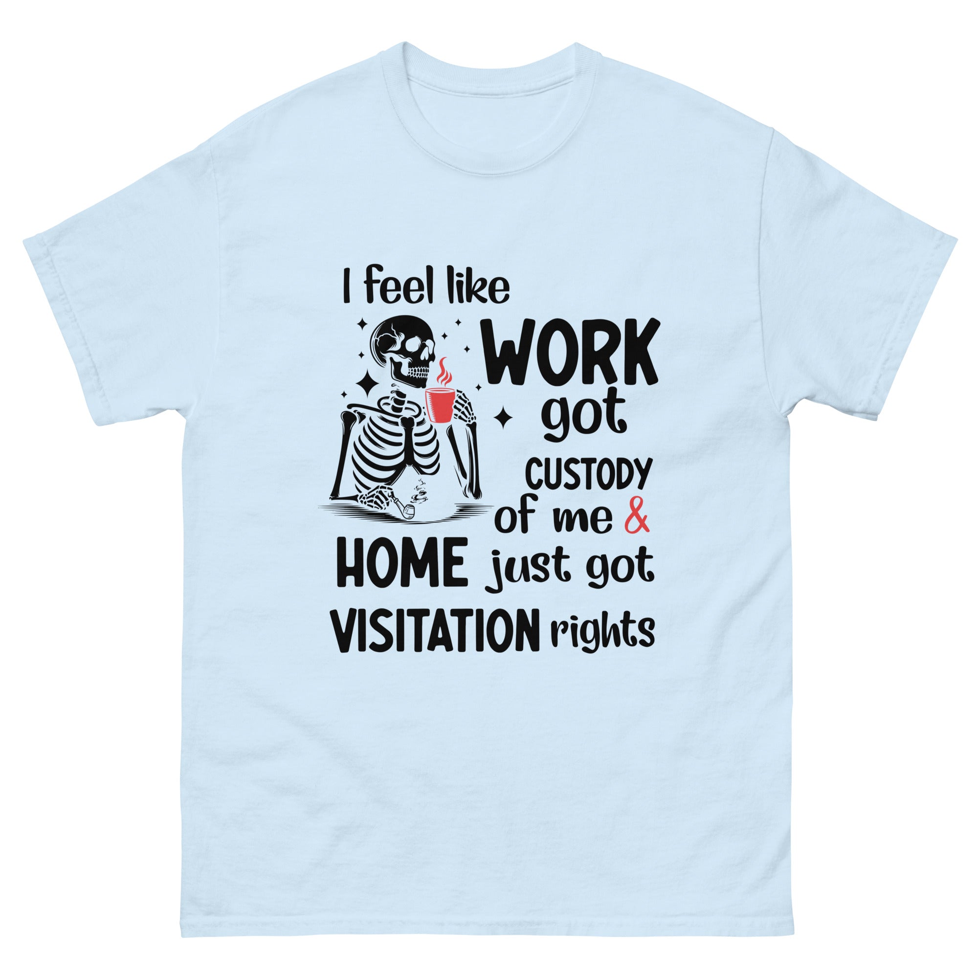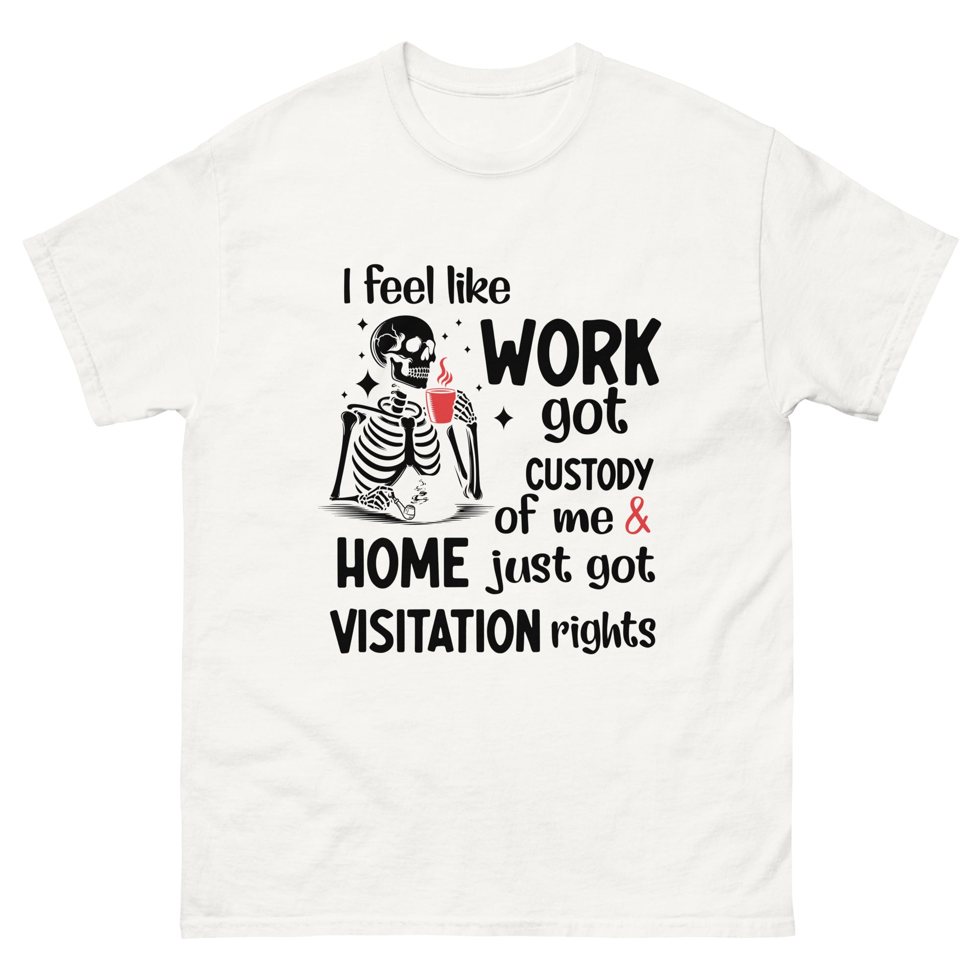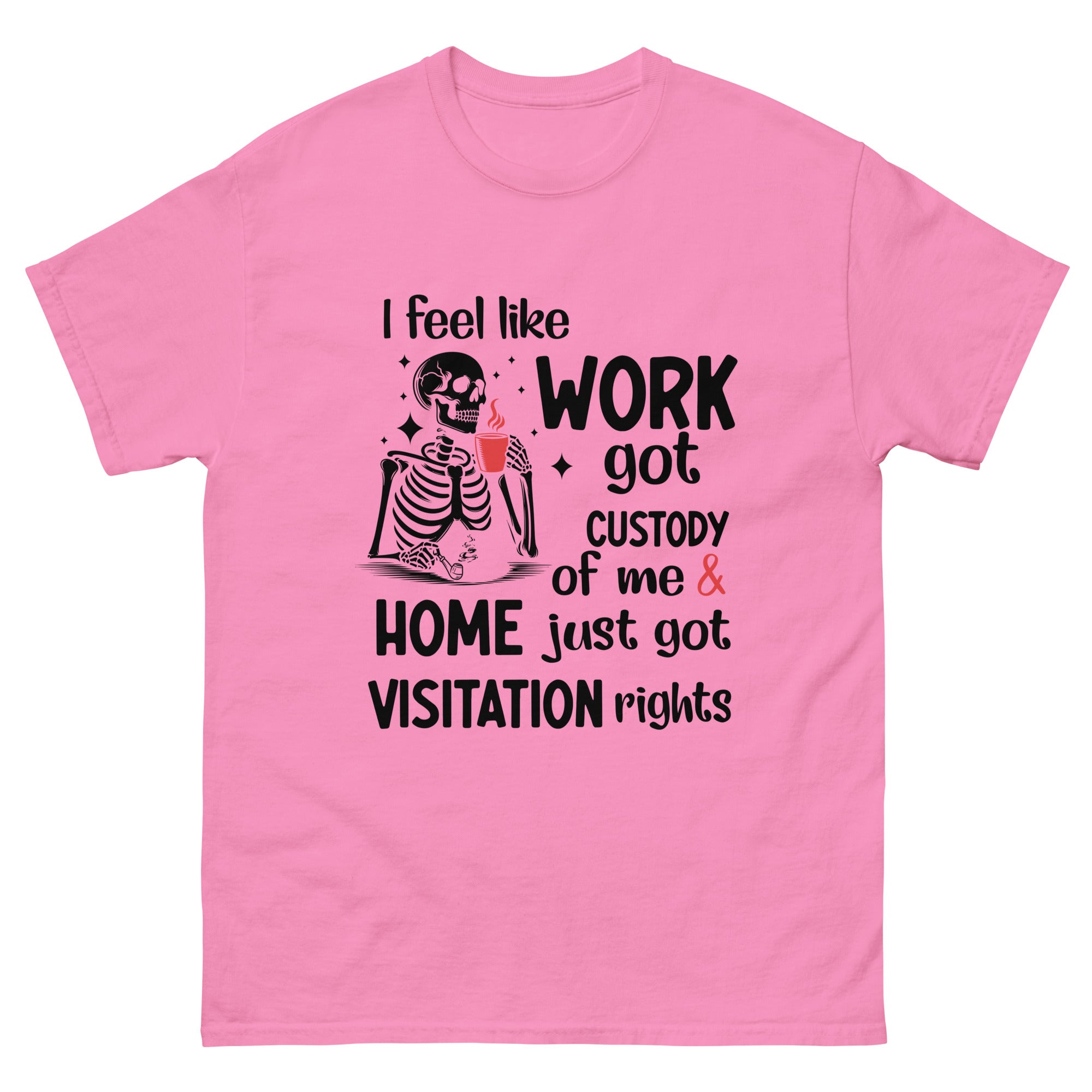 T-shirt featuring our iconic I FEEL LIKE WORK GOT CUSTODY design.